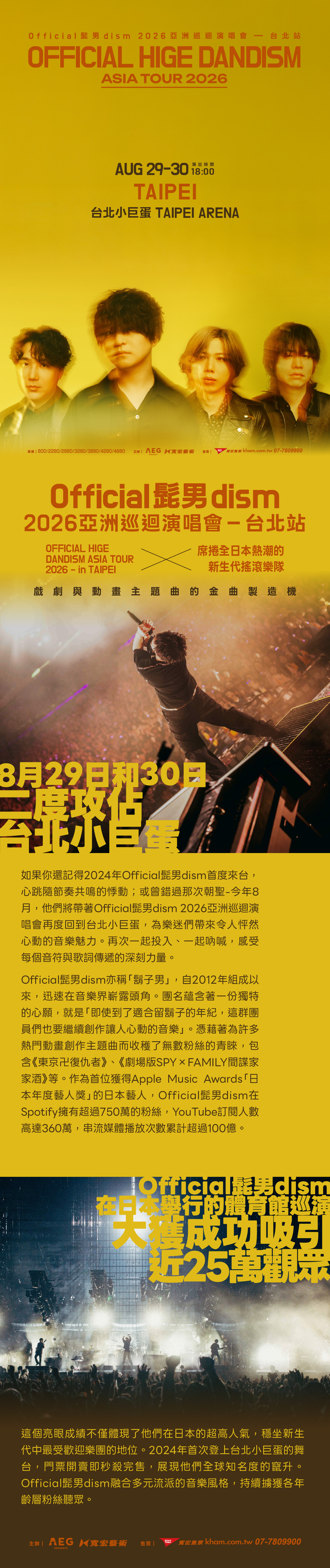 Official髭男dism 的国际影响力同样惊人──他们是首位获得 Apple Music Awards「日本年度艺人奖」的日本艺人,Spotify 粉丝超过750万人,YouTube 订阅人数高达360万,全球串流播放次数累积超过100亿次。2024年在日本巨蛋展开巡演,吸引近30万观众,充分展现 Official髭男dism 在全球乐迷心中的强大影响力。