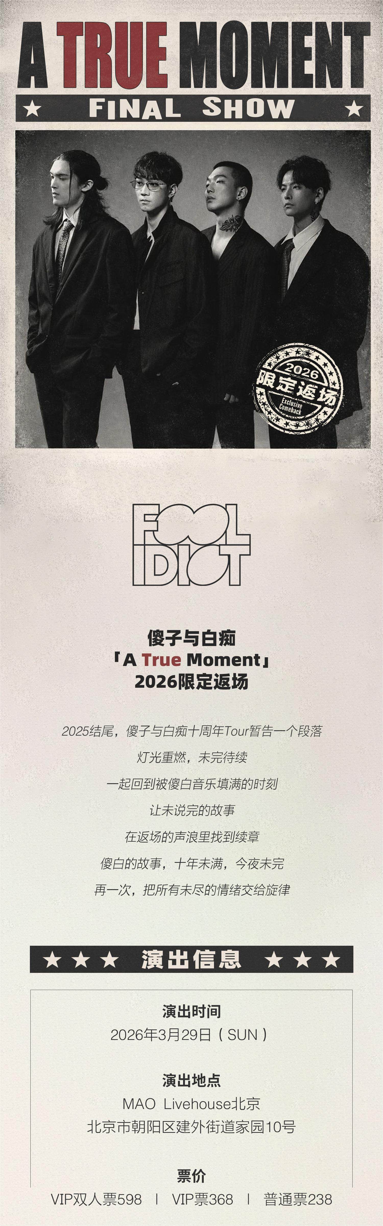 傻子与白痴「A True Moment 」2026限定返场「北京站」