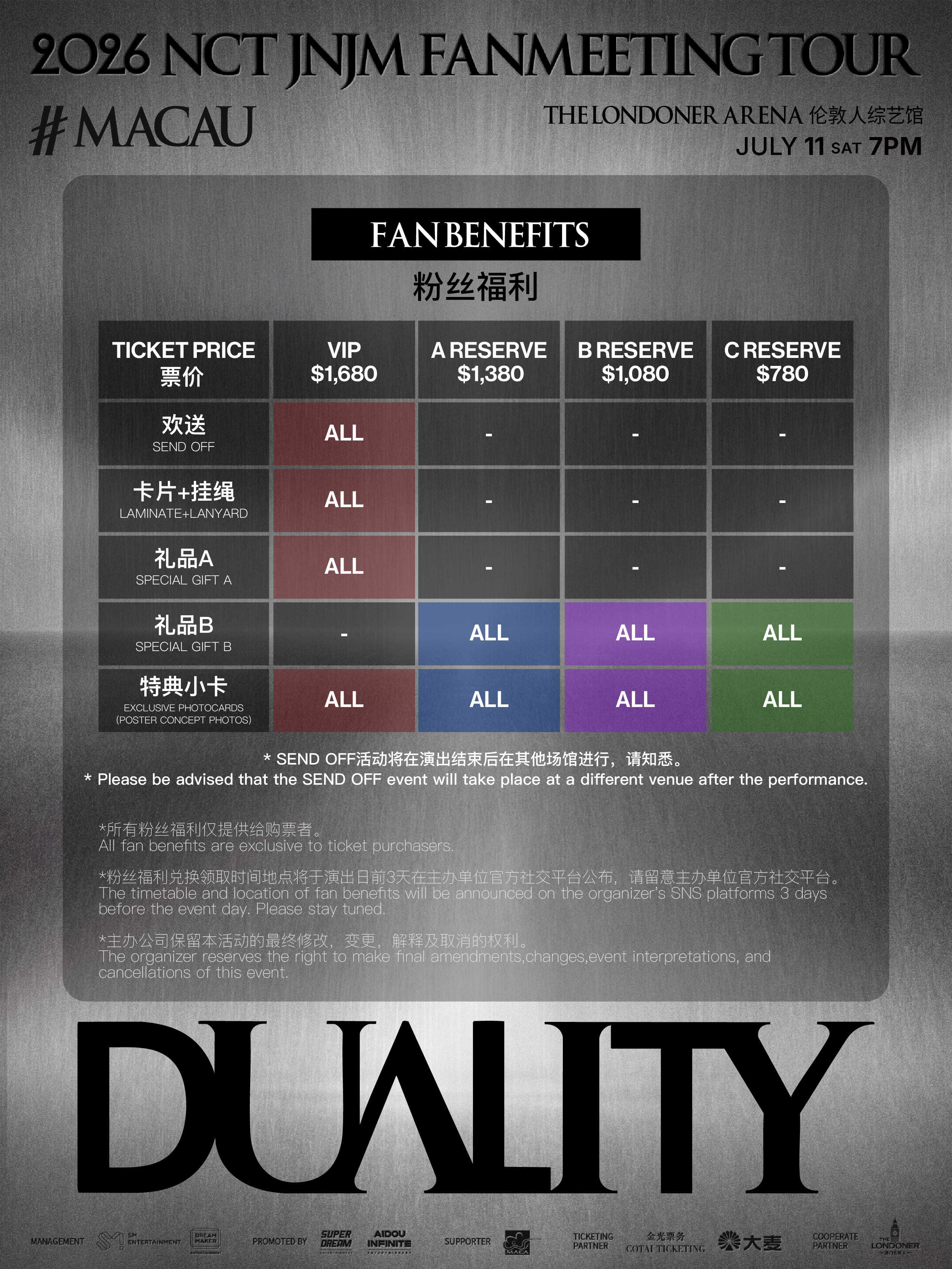 其中,澳门站将于2026年7月11日举行。在此次以“DUALITY”为主题的巡演中,NCT JNJM将不仅带来展现两人音乐与表演协同效应的舞台,还将通过丰富多样的互动环节,呈现他们多层次的魅力,与粉丝共同度过一段特别而难忘的时光。澳门场的演出也将延续这一理念,为当地及来自各地的粉丝献上一场视听与情感兼具的见面会。