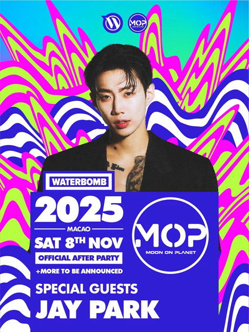 水花未干,派对未完! 11月8日WATERBOMB将延伸到夜幕之后,MOP接管派对主场!特别嘉宾包括韩流天王Jay Park、还有两位Guest DJ Lizzy,Yua,将以最强火力带来最热韩流夜。