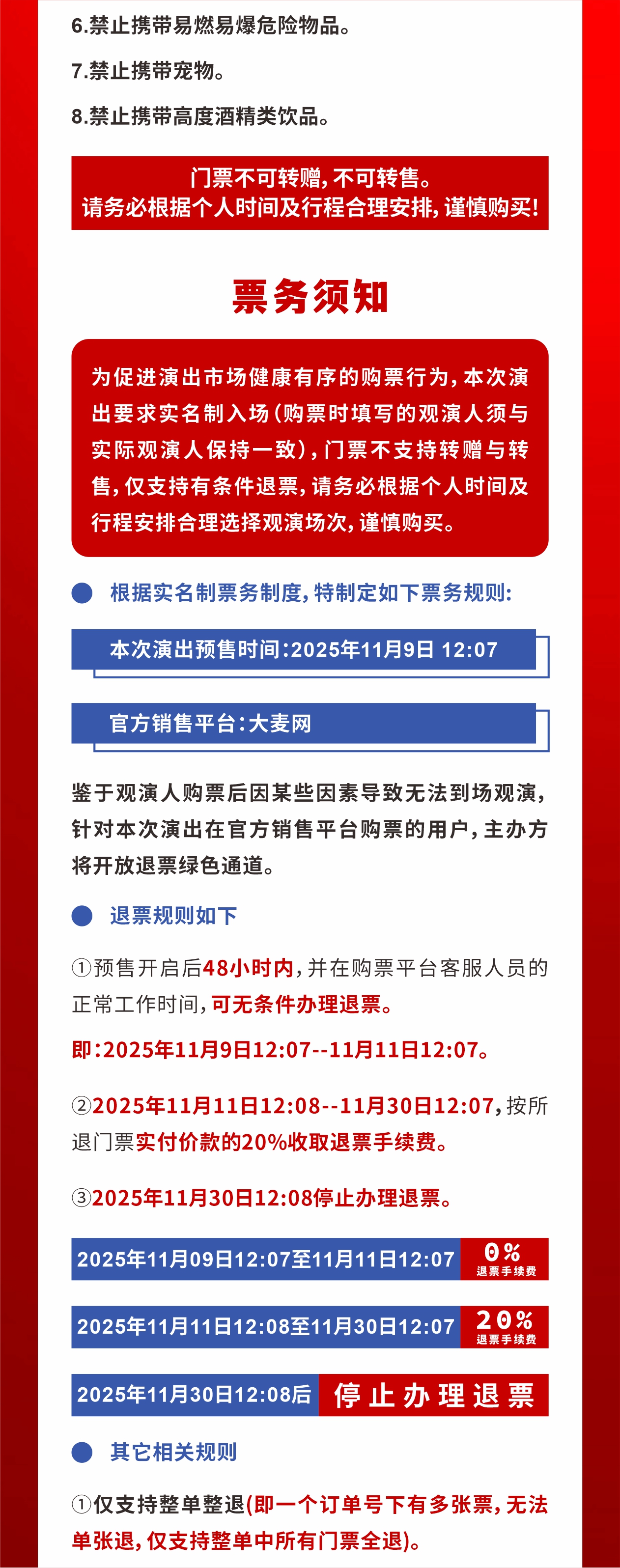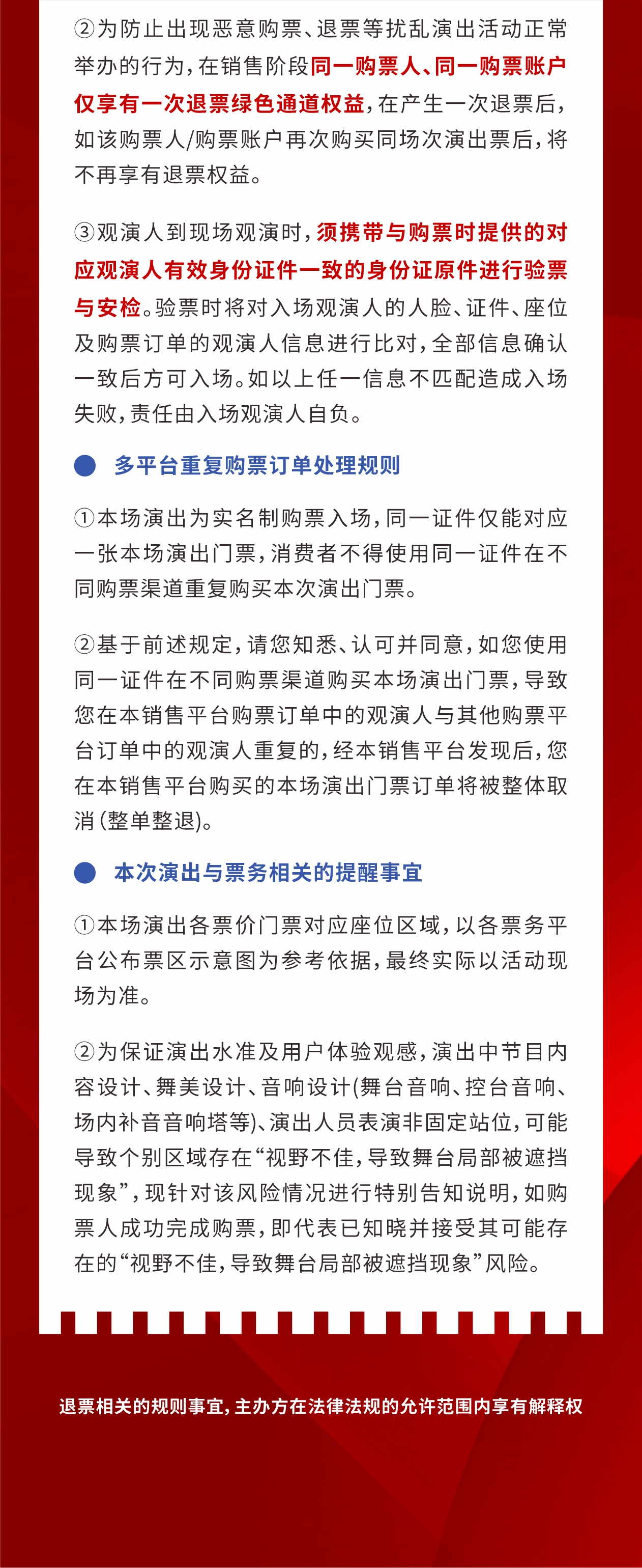 1.演出票品为特殊商品,除不可抗力因素导致演出取消外,订单不支持退换,可在平台转售;