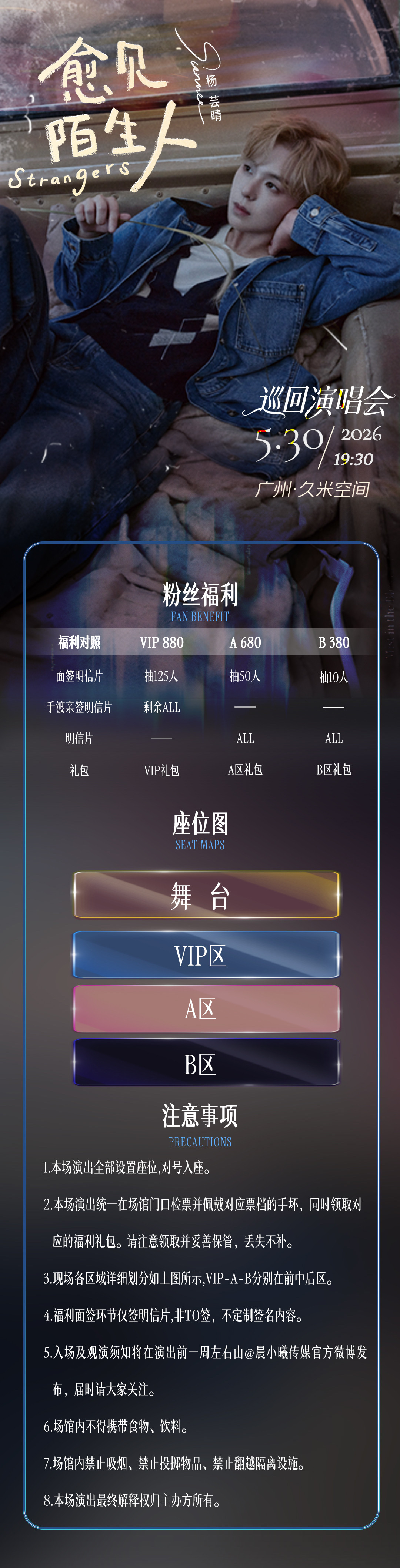 于是,音乐不再只停留于太阳星的耳机里,而成了连接光芒的纽带,Sunnee杨芸晴2026「愈见陌生人」巡回演唱会,将以《愈见陌生人》EP的创作内核为基调,打造一场关于相遇、治愈与联结的音乐盛宴。这次演唱会上,她将完整演绎新EP中的五首曲目与之前那些曾陪伴她走过不同阶段的代表作品。每一首歌的舞台呈现都会紧扣创作创意,用沉浸式的视觉与听觉融合,让太阳星读懂藏在旋律里的细腻心思。