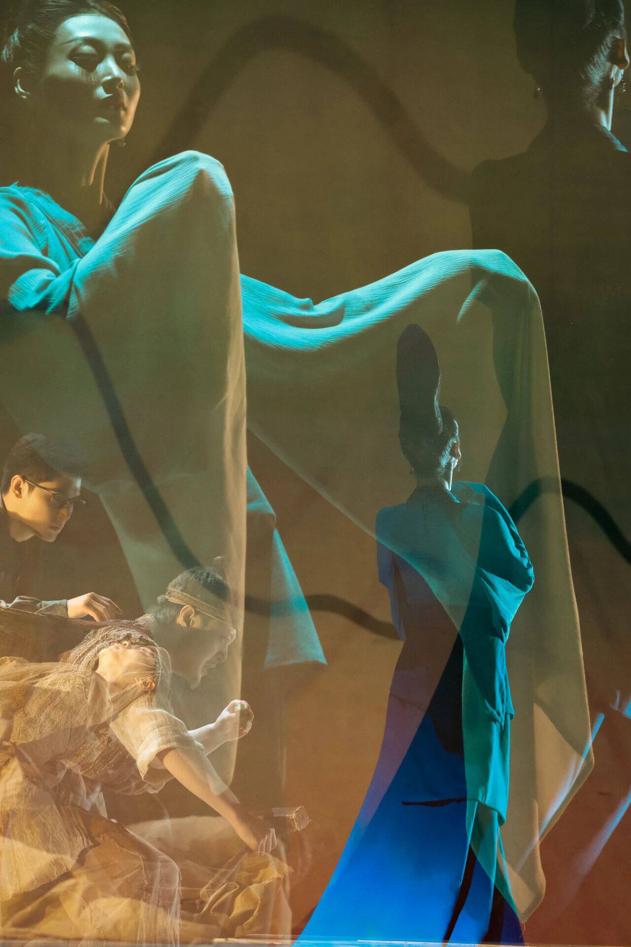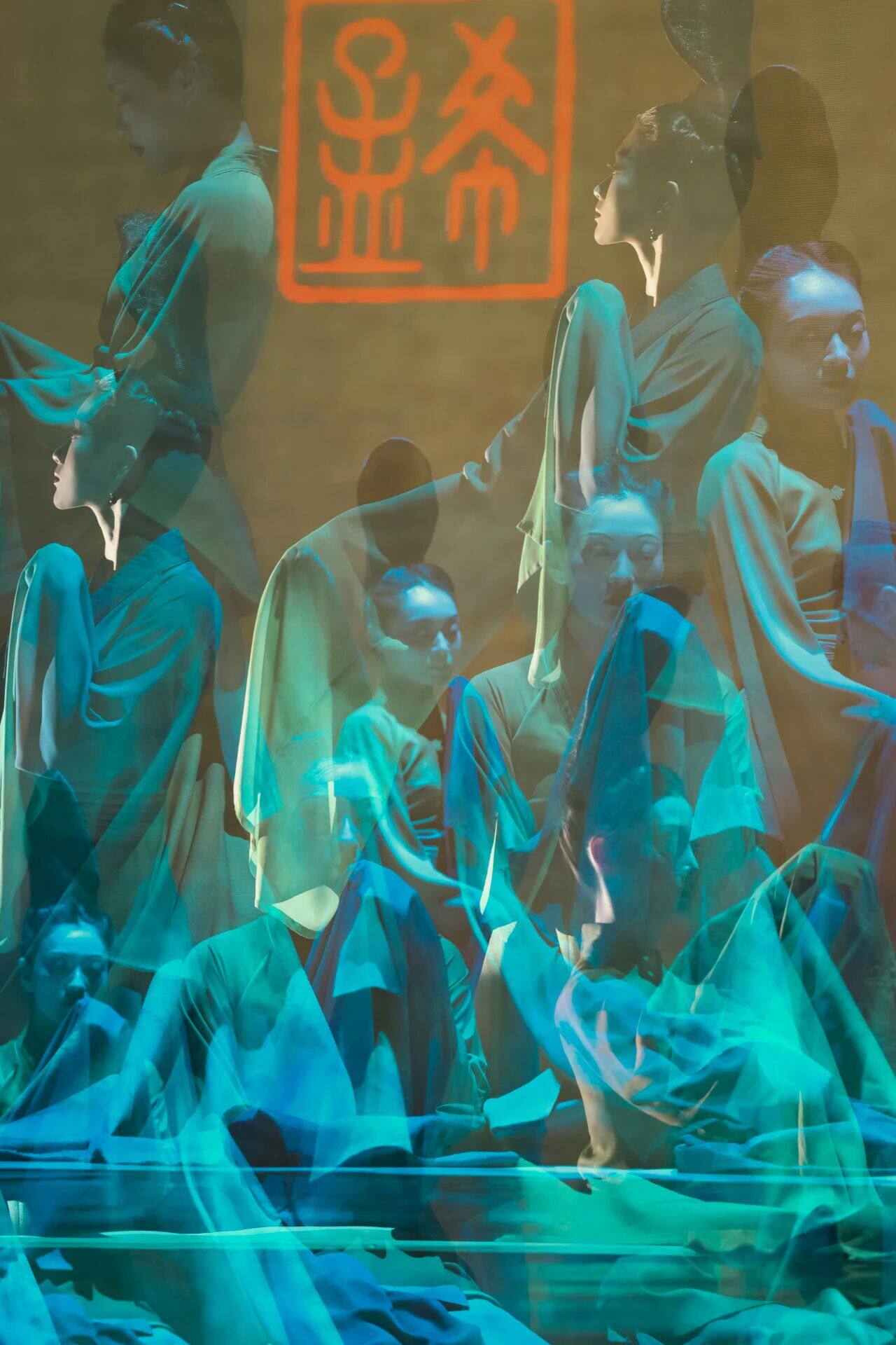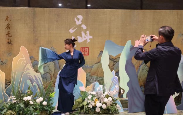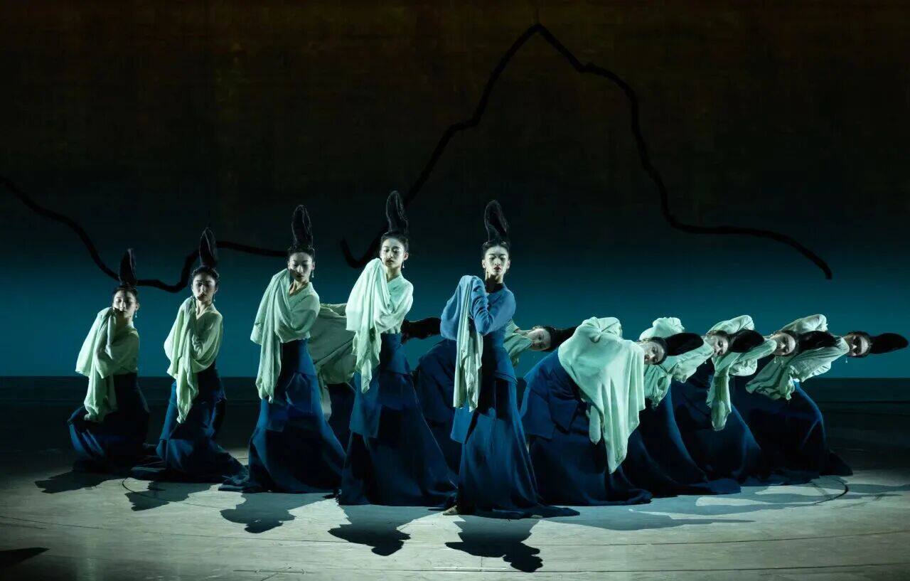 在山峦叠嶂的舞台背景前缓缓起舞