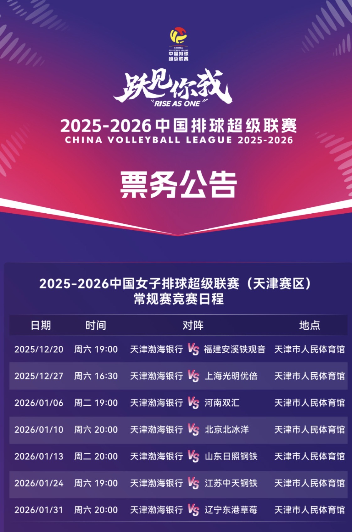 2025-2026中國排球超級聯賽天津渤海女子排球俱樂部主場賽事