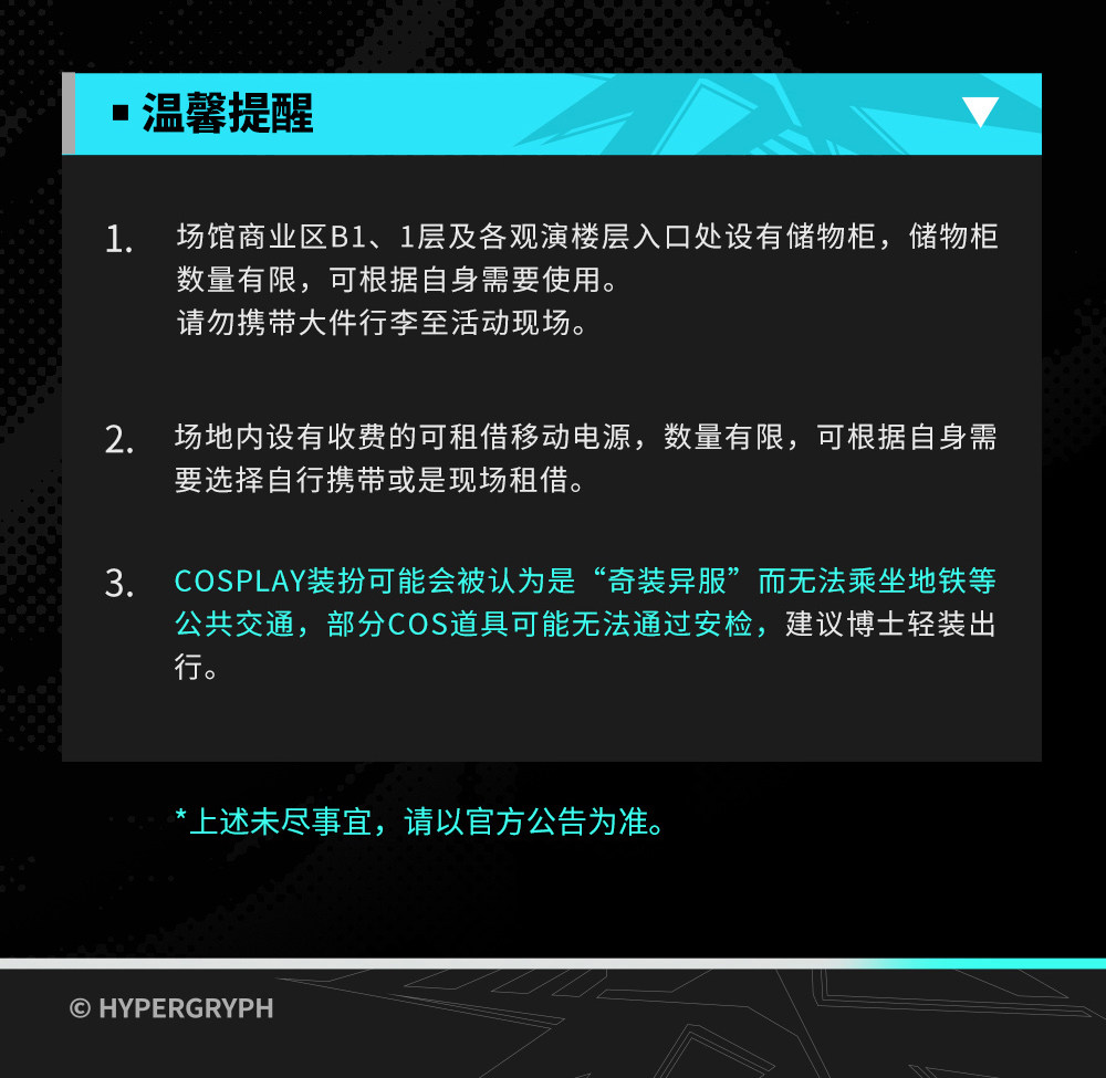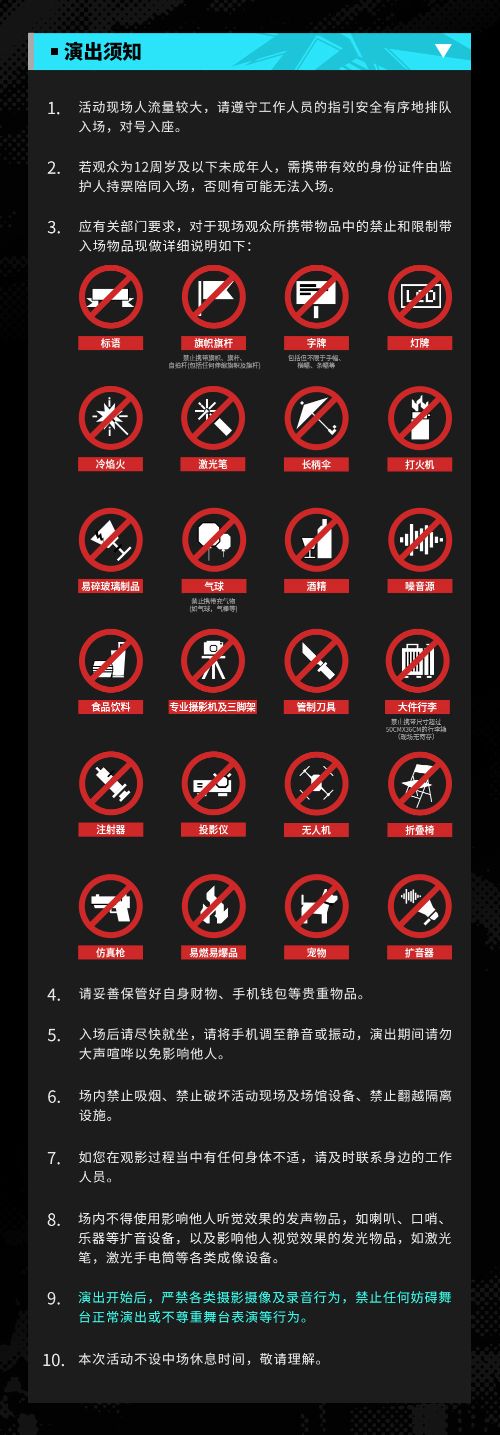 本场演出部分节目包含激光表演,为保障观演安全及视线效果,激光不会直射博士,而会投射在内场座位及看台座位之间的墙体。