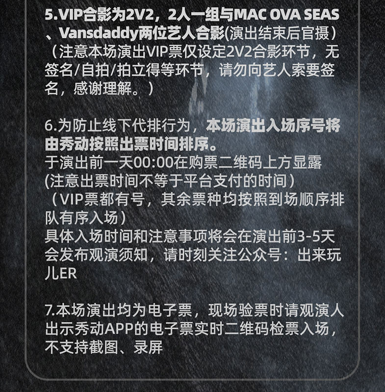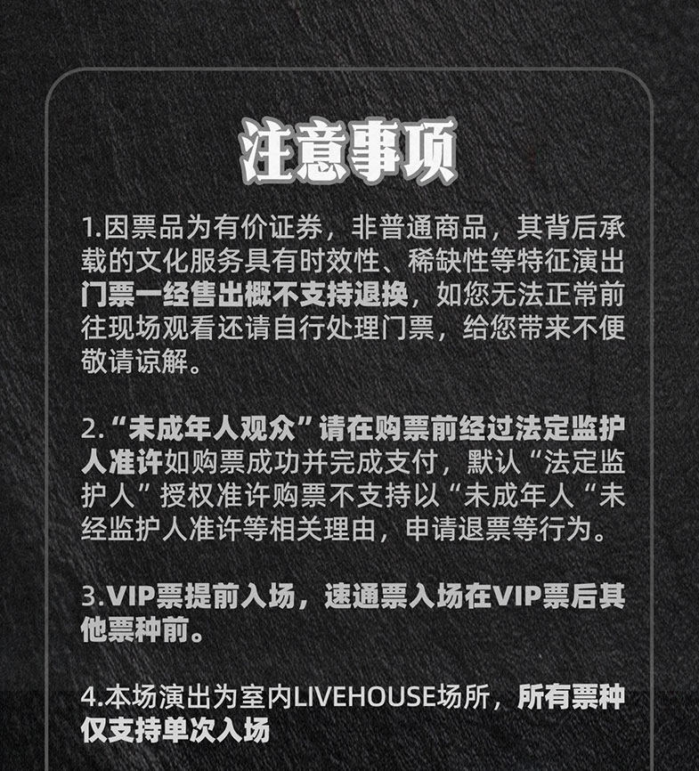 1.演出票品为特殊商品,除不可抗力因素导致演出取消外,订单不支持退换,可在平台转售;