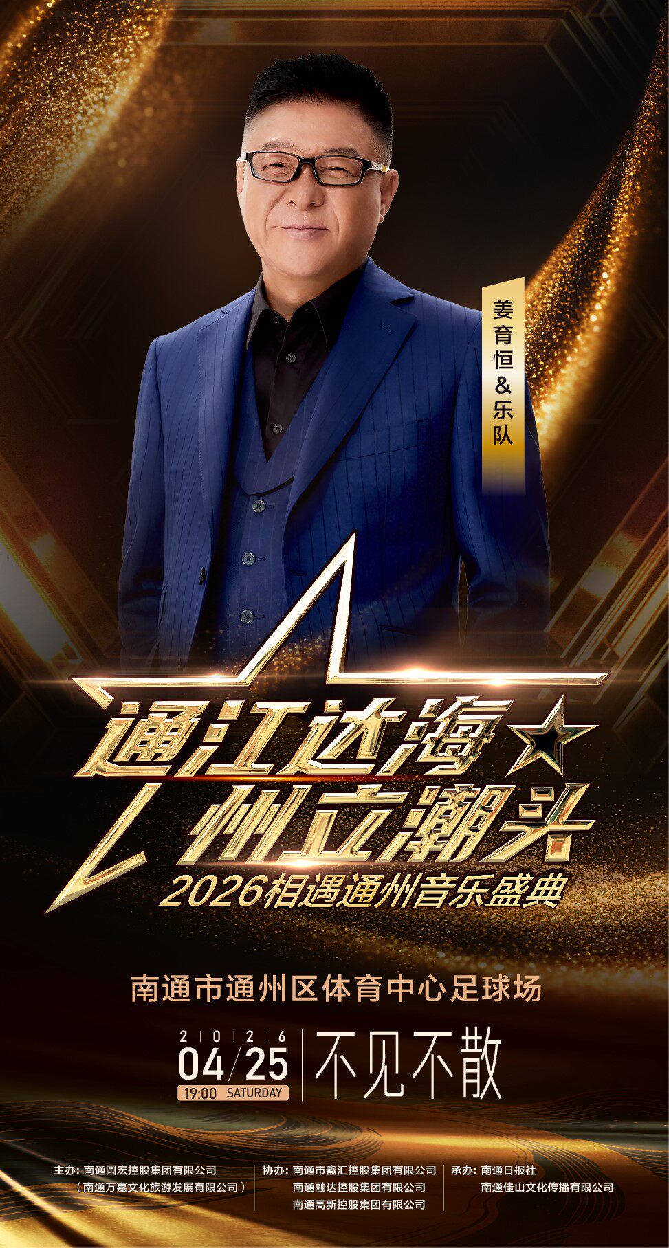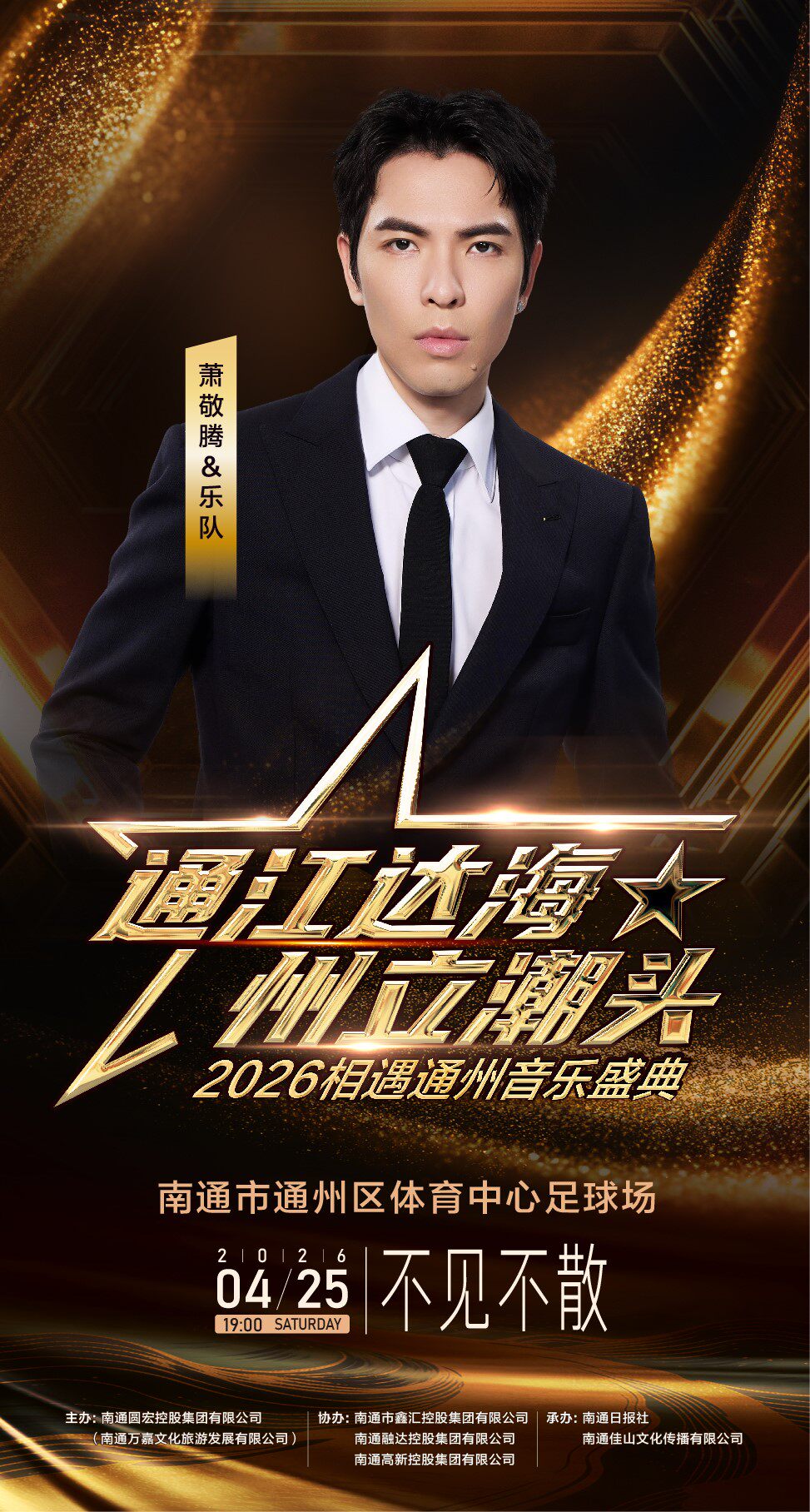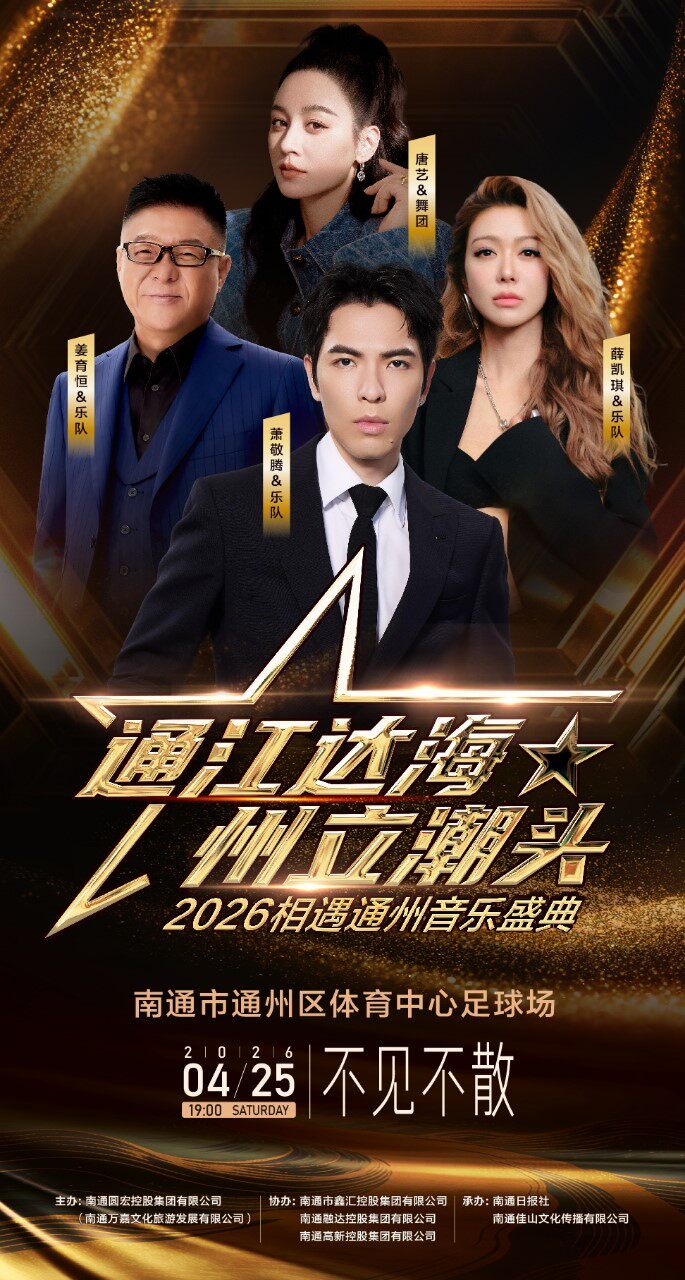 "通江达海~州立潮头"2026相遇通州音乐盛典,将于4月25日晚激情开唱,华语歌坛实力唱将萧敬腾、薛凯琪、姜育恒、唐艺,将齐聚通州区体育中心足球场,为观众带来一场跨越代际、融合经典与潮流的视听盛宴。