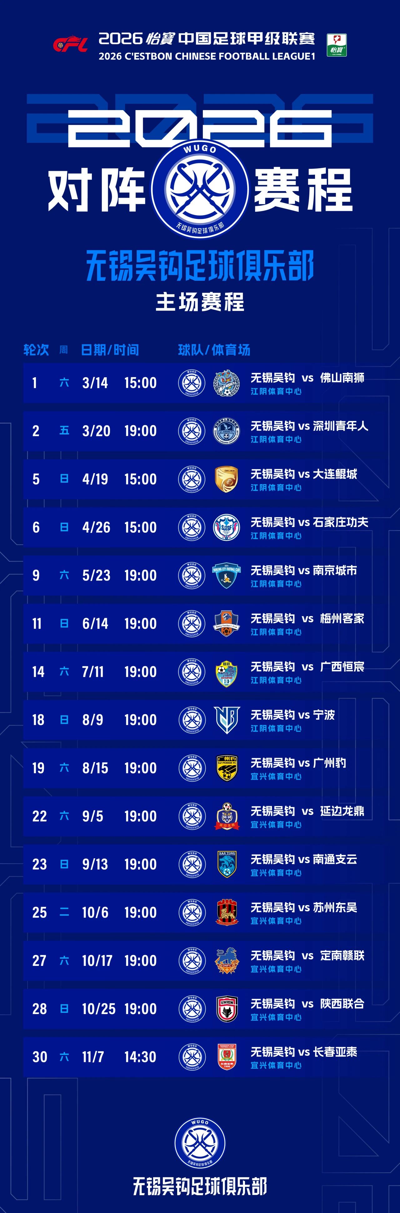 【无锡】2026赛季中甲联赛无锡吴钩主场门票